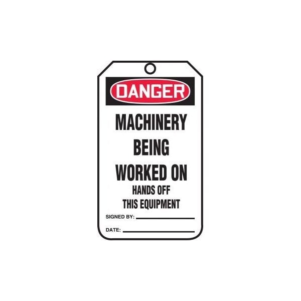 Safety Tags, DANGER MACHINERY BEING WORKED ON HANDS OFF THIS EQUIP, 5.75in x 3.25in, PF-Cardstock, 25PK