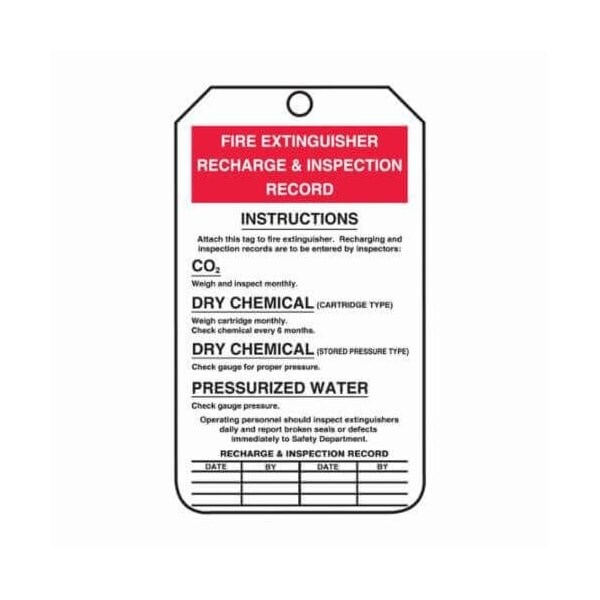 Accuform Fire Extinguisher Tag, FIRE EXTINGUISHER RECHARGE INSPECTION RECORD Legend, BlackRedWhite LegendBackground, 534 in Height, 314 in Width, PFCardstock, 38 in Hole, Reinforced PullProof Metal Grommet