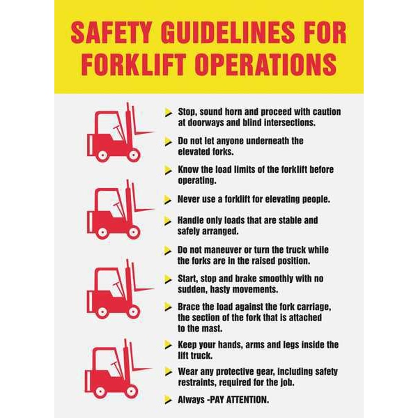 Poster, Shape Vertical Rectangle, Safety Banner Legend Safety Guidelines For Forklift Operations, Sign Legend Style Symbol and Text, Printed Language English, Background Color White, Number of Printed Sides 1, Width 17 in, Height 22 in, Thickness 0.024 in