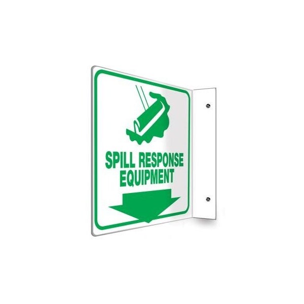 Accuform Projection Sign, 90D, TextSymbol Legend, SPILL RESPONSE EQUIPMENT ARROW DOWN Legend, 01 in Plastic, 8 in Height, 12 in Width, Green on white LegendBackgroundProjection Signs provide identification, location, and direction that can be easily seen from various angles for extra visibility