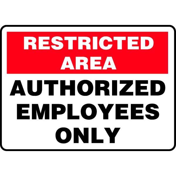 Restricted Area Sign, Sign Subject Matter Authorized Personnel and Restricted Access, Height 10 in, Width 14 in, Sign Material Aluminum, Sign Mounting Style With Mounting Holes, Header No Header, Legend Restricted Area Authorized Employees Only, Printed Language English, Sign Shape Rectangle