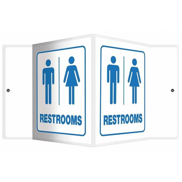 V-Shape Projection Sign, Sign Subject Matter Restrooms, Height 6 In., Width 8-1/2 In., Sign Material Plastic, Sign Mounting Style With Mounting Holes, V-Shaped, Header No Header, Legend Restrooms, Printed Language English, Sign Shape V-Shaped