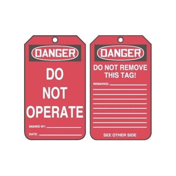 Accuform Safety Tag, DANGER DO NOT OPERATE Legend, 534 in Height, 314 in Width, RPPlastic, 38 in Hole, Reinforced PullProof Metal Grommet