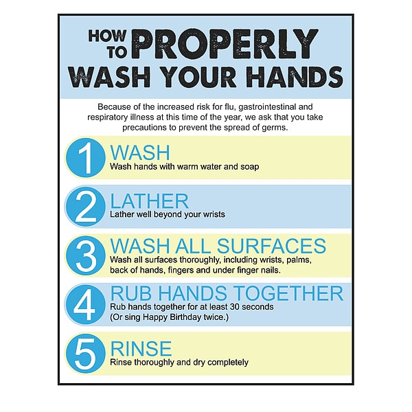 How To Properly Wash Your Hands, 1.Wash, 2.Lather, 3.Wash All Surfaces, 4.Rub Hands Together, 5.Rinse