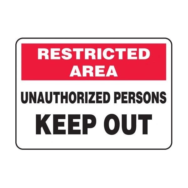 Accuform Safety Sign, Header RESTRICTED AREA, Text Legend, Legend UNAUTHORIZED PERSONS KEEP OUT, 4 mil Adhesive Vinyl, Adhesive Surface Mounting, 7 in Height, 10 in Width, Black on white SignWhite on red Header LegendBackgroundSafety Signs identify and indicate potential, type and degree of hazards that may lead to accidental injury or property damage Adhesive Vinyl is the ideal choice for a variety of indoor and sheltered outdoor, marking needs Easily mounts to all curved areas such as pipes, poles and secondary containers Adhesive Vinyl signs feature a printed matte surface, moistureresistance and scored backing for quick peeloff and application