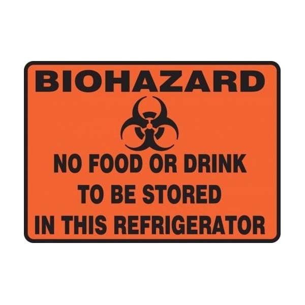 Accuform Safety Sign, BIOHAZARD Header, Language English, TextSymbol Legend, NO FOOD OR DRINK TO BE STORed in THIS REFRIGERATOR GRAPHIC Legend, 0055 in Plastic, 7 in Height, 10 in Width, Black on Orange