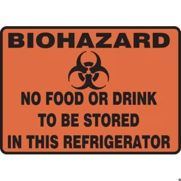 Accuform Safety Sign, Language English, TextSymbol Legend, BIOHAZARD NO FOOD OR DRINK TO BE STORed in THIS REFRIGERATOR WBIOHAZARD GRAPHIC Legend, 5 mil Adhesive DuraVinyl, 7 in Height, 10 in Width, Black on Orange