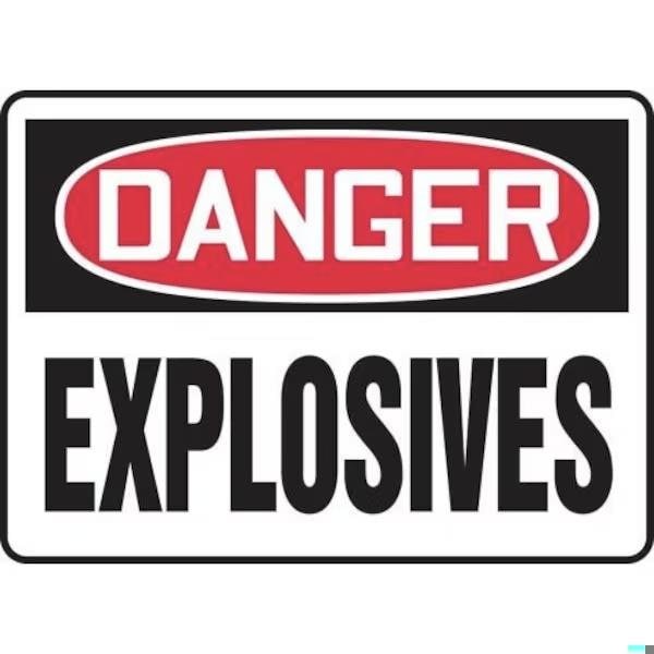 Accuform Safety Sign, Header DANGER, Language English, Text Legend, Legend EXPLOSIVES, 004 in Aluminum, Hole Mounting, 7 in Height, 10 in Width, Black on white SignWhite on BlackRed Header LegendBackground