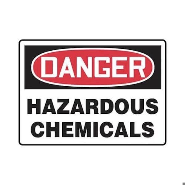 Accuform Safety Sign, Header DANGER, Language English, Text Legend, Legend HAZARDOUS CHEMICALS, 4 mil Adhesive Vinyl, Surface Mounting, 10 in Height, 14 in Width, Black on white SignWhite on BlackRed Header LegendBackground