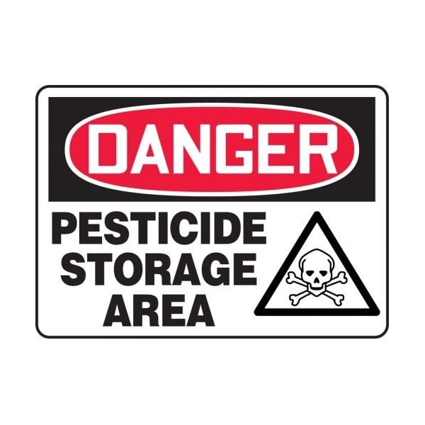 Accuform Safety Sign, DANGER Header, Language English, TextSymbol Legend, PESTICIDE STORAGE AREA GRAPHIC Legend, 004 in Aluminum, Hole Mount, 10 in Height, 14 in Width, Black on white SignWhite on BlackRed Header