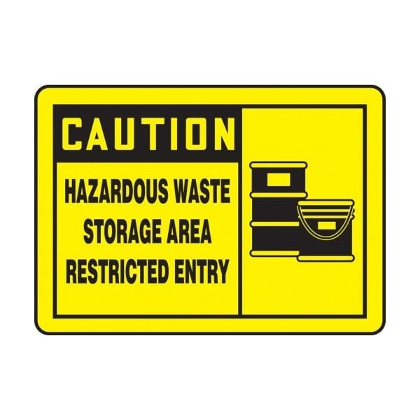 Accuform Safety Sign, CAUTION Header, Language English, TextSymbol Legend, HAZARDOUS WASTE STORAGE AREA RESTRICTED ENTRY Legend, Adhesive DuraVinyl, 7 in Height, 10 in Width, Black on Yellow SignYellow on Black Header