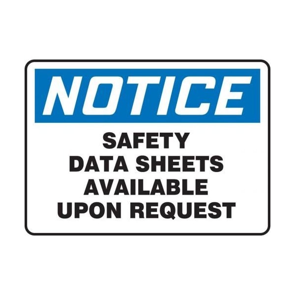 Accuform Safety Sign, Header NOTICE, Language English, Text Legend, Legend SAFETY DATA SHEETS AVAILABLE UPON REQUEST, 004 in Aluminum, Hole Mounting, 7 in Height, 10 in Width, Black on white SignWhite on Blue Header LegendBackground