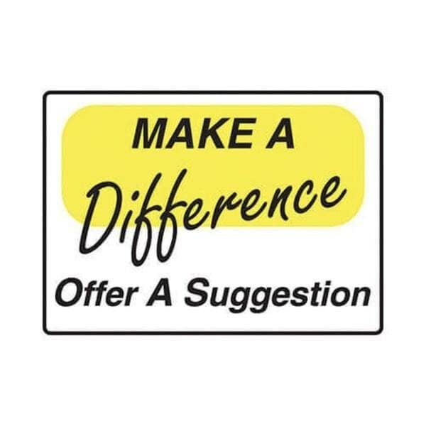 Accuform Safety Sign, Legend MAKE A DIFFERENCE OFFER A SUGGESTION, Recycled Plastic, 10 in Height, 14 in Width, BlackYellow on white LegendBackgroundCustom motivational products and digiday electronic scoreboards lead the way in a parade of protection Enter a new generation of safety made up of moving message displays, banners, posters, window and wall graphics, motivational signs and products that drive your company to work healthy