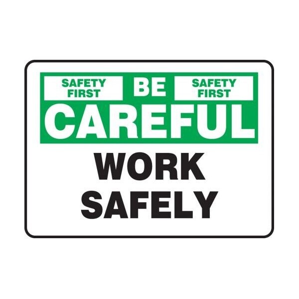 Accuform Safety Sign, Header NO HEADER, Text Legend, Legend SAFETY FIRST BE CAREFUL WORK SAFELY, 4 mil Adhesive Vinyl, Surface Mounting, 10 in Height, 14 in Width, BlackGreen on white LegendBackgroundSafety Signs identify and indicate potential, type and degree of hazards that may lead to accidental injury or property damage Adhesive Vinyl is the ideal choice for a variety of indoor and sheltered outdoor, marking needs Easily mounts to all curved areas such as pipes, poles and secondary containers Adhesive Vinyl signs feature a printed matte surface, moistureresistance and scored backing for quick peeloff and application