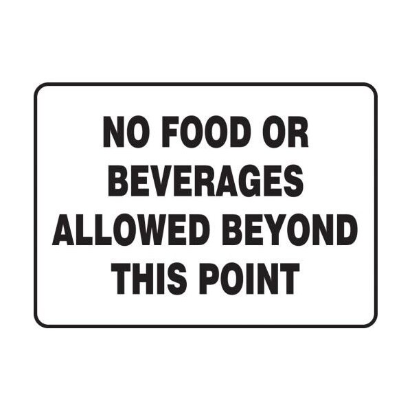 Accuform Safety Sign, Header NO HEADER, Text Legend, Legend NO FOOD OR BEVERAGES ALLOWED BEYOND THIS POINT, 004 in Aluminum, Hole Mounting, 7 in Height, 10 in Width, Black on white LegendBackgroundSafety Signs identify and indicate potential, type and degree of hazards that may lead to accidental injury or property damage Aluminum signs withstand washdowns, harsh elements, abusive conditions and feature good chemical, abrasion and impact resistance Aluminum is excellent for indoor and outdoor usage, making it ideal for a wide variety of industrialstrength applications