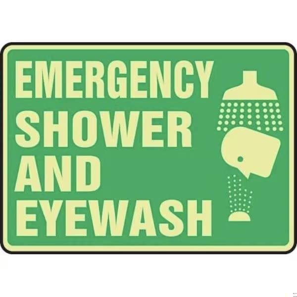 Accuform Safety Sign, Legend EMERGENCY SHOWER AND EYEWASH WGRAPHIC, 10 mil LumiGlow Flex, 10 in Height, 14 in Width, Glow on Green LegendBackground Safety Signs identify and indicate potential, type, and degree of hazards that may lead to accidental injury or property damage Even when the lights go out, LumiGlow Flex signs are visible with a greenyellow glow surface Any light source can 'energize' the photoluminescent material Flexible material is ideal for extended indoor and shortterm outdoor conditions Resistant to UV light, some chemicals, and moisture