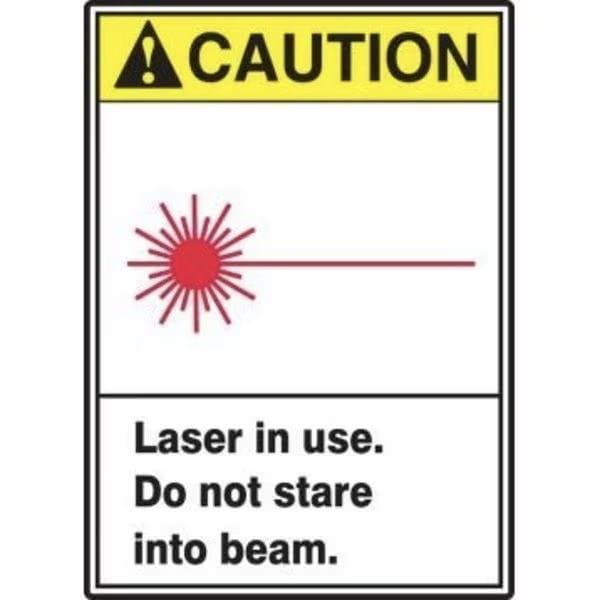 Accuform Safety Sign, Rectangle, CAUTION Header, Language English, TextSymbol Legend, ANSI GRAPHIC LASER in USE DO NOT STARE INTO BEAM GRAPHIC Legend, 6 mil Adhesive DuraVinyl, 14 in Height, 10 in Width, Black on white SignWhite on Yellow Header