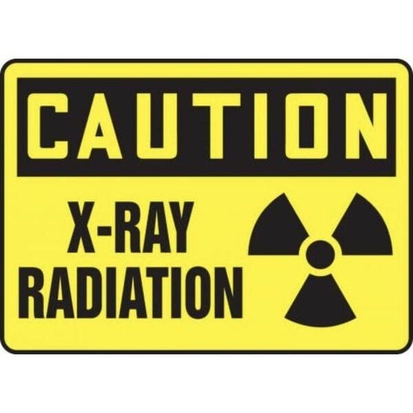 Accuform Safety Sign, Header CAUTION, Legend XRAY RADIATION WGRAPHIC, 6 mil Adhesive DuraVinyl, 10 in Height, 14 in Width, Black on Yellow SignYellow on Black Header LegendBackground