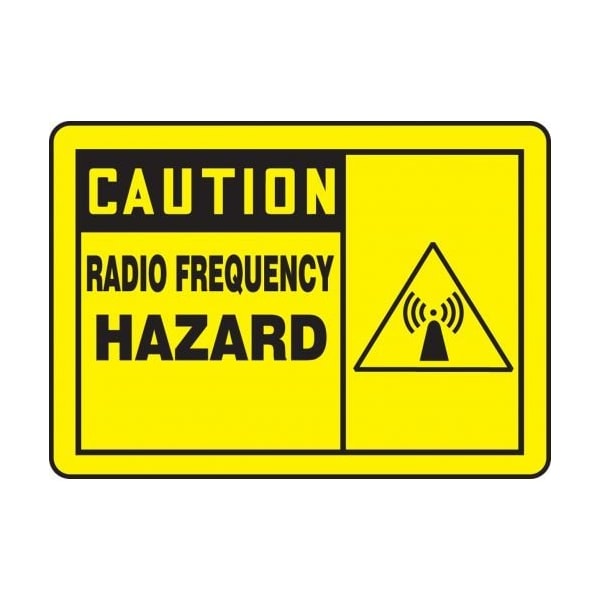 Accuform Safety Sign, Rectangle, CAUTION Header, Language English, TextSymbol Legend, RADIO FREQUENCY HAZARD GRAPHIC Legend, 0055 in Plastic, 10 in Height, 14 in Width, Black on Yellow SignYellow on Black Header