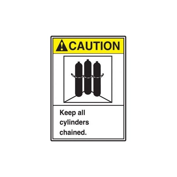 Accuform Safety Sign, Rectangle, CAUTION Header, Language English, TextSymbol Legend, ANSI KEEP ALL CYLINDERS CHAINED GRAPHIC Legend, 4 mil Adhesive Vinyl, Surface Mount, 10 in Height, 7 in Width, Black on white SignWhite on Yellow Header