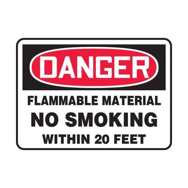 Accuform Safety Sign, Rectangle, Header DANGER, Language English, Text Legend, Legend FLAMMABLE MATERIAL NO SMOKING WITHIN 20 FEET, 004 in Aluminum, 10 in Height, 14 in Width, Black on white SignWhite on BlackRed Header LegendBackground