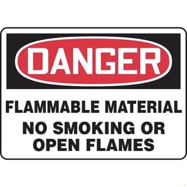 Accuform Safety Sign, Rectangle, Header DANGER, Language English, Text Legend, Legend FLAMMABLE MATERIAL NO SMOKING OR OPEN FLAMES, 6 mil Adhesive DuraVinyl, 10 in Height, 14 in Width, Black on white SignWhite on BlackRed Header LegendBackground