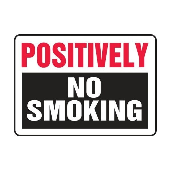 Accuform Safety Sign, Header NO HEADER, Text Legend, Legend POSITIVELY NO SMOKING, 4 mil Adhesive Vinyl, Adhesive Surface Mounting, 7 in Height, 10 in Width, RedWhiteBlackWhite LegendBackgroundSafety Signs identify and indicate potential, type and degree of hazards that may lead to accidental injury or property damage Adhesive Vinyl is the ideal choice for a variety of indoor and sheltered outdoor, marking needs Easily mounts to all curved areas such as pipes, poles and secondary containers Adhesive Vinyl signs feature a printed matte surface, moistureresistance and scored backing for quick peeloff and application