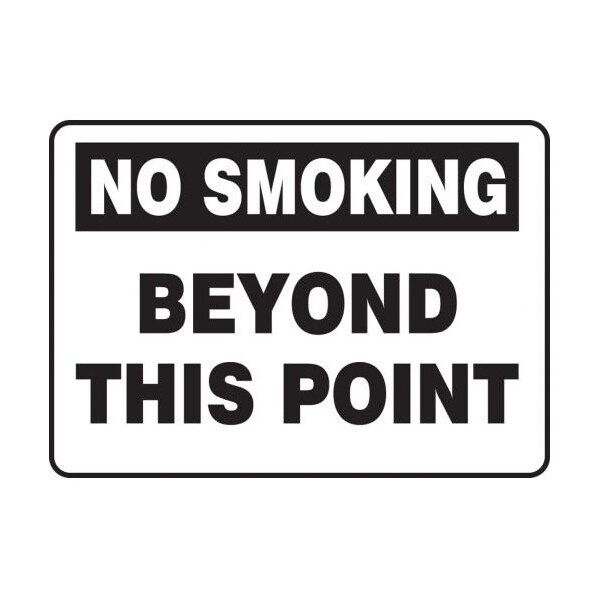 Accuform Safety Sign, Header NO HEADER, Text Legend, Legend NO SMOKING BEYOND THIS POINT, 0055 in Plastic, 10 in Height, 14 in Width, BlackWhite LegendBackgroundSafety Signs identify and indicate potential, type and degree of hazards that may lead to accidental injury or property damage Plastic signs are semiflexible, made with 50 recycled content and ideal for indoor and shortterm, sheltered outdoor environments Plastic signs feature good impact resistance, UV inhibitors and enough flex to mount on slightly curved areas
