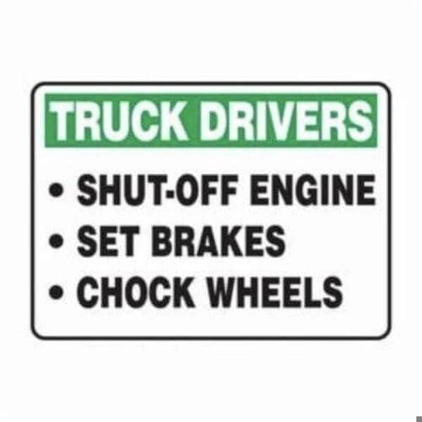 Accuform Safety Sign, Text Legend, Legend TRUCK DRIVERS SHUTOFF ENGINE SET BRAKES CHOCK WHEELS, 6 mil Adhesive DuraVinyl, 10 in Height, 14 in WidthSafety Signs identify and indicate potential, type, and degree of hazards that may lead to accidental injury or property damage Duallayered Adhesive DuraVinyl delivers exceptional flexibility and performance, outperforming standard vinyl Printed image is protected by a highgloss UV protective coating Adhesive DuraVinyl is durable, even in the toughest indoor and outdoor conditions, and adheres to most smooth, curved, and irregular surfaces