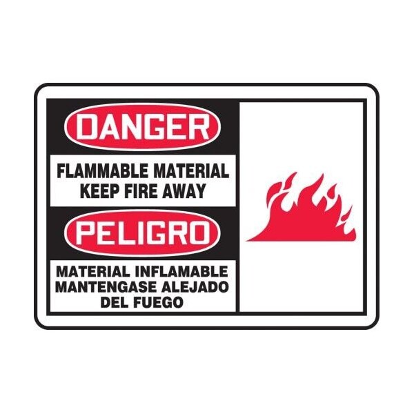 Accuform Safety Sign, Bilingual Rectangle, DANGERPELIGRO Header, Language EnglishSpanish, TextSymbol Legend, FLAMMABLE MATERIAL KEEP FIRE AWAYMATERIAL INFLAMABLE MANTENGASE ALEJADO DEL FUEGO GRAPHIC Legend, 0055 in Plastic, 7 in Height, 10 in Width, Black on white SignWhite on BlackRed Header