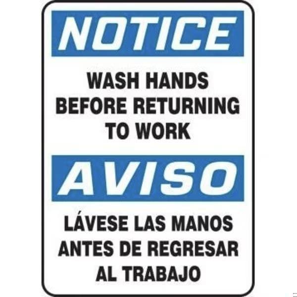 Accuform Safety Sign, Bilingual, Header NOTICEAVISO, Language EnglishSpanish, Text Legend, Legend WASH HANDS BEFORE RETURNING TO WORKLAVESE LAS MANOS ANTES DE REGRESAR AL TRABAJO, Aluminum, 20 in Height, 14 in WidthChoose your safety signs and safety labels from custom or stock No minimum quantities are required, no set up fees and most importantly no additional charge for colors or logos Once you find the safety sign or safety label that delivers the information or warning message you need, consider having your custom or stock order shipped within 24 hr