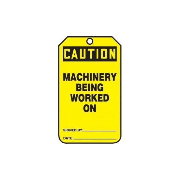 Safety Tags, CAUTION MACHINERY BEING WORKED ON, 5.75in x 3.25in, RP-Plastic, 5PK