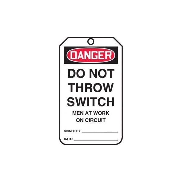 Safety Tags, DANGER DO NOT THROW SWITCH MEN AT WORK ON CIRCUIT, 5.75in x 3.25in, RP-Plastic, 25PK