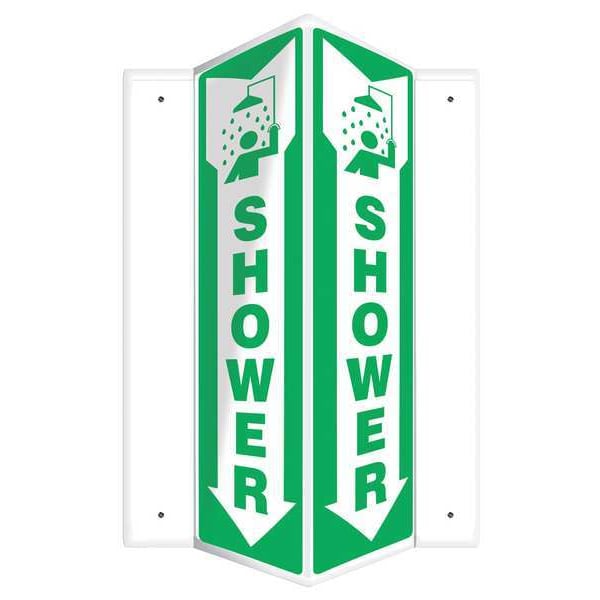 V-Shape Projection Sign, Sign Subject Matter Eyewash and Shower, Height 18 In., Width 7-1/2 In., Sign Material Plastic, Sign Mounting Style With Mounting Holes, V-Shaped, Header No Header, Legend Shower, Printed Language English, Sign Shape V-Shaped