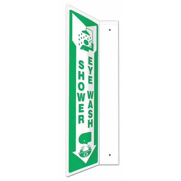 L-Shape Projection Sign, Sign Subject Matter Eyewash and Shower, Height 18 In., Width 4 In., Sign Material Plastic, Sign Mounting Style With Mounting Holes, L-Shaped, Header No Header, Legend Shower Eye Wash, Printed Language English, Sign Shape L-Shaped