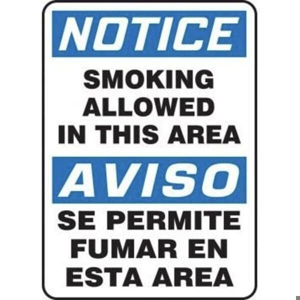 Accuform Notice Sign, Bilingual, Header NOTICE, Legend SMOKING ALLOWED IN THIS AREAAVISO SE PERMITE FUMAR EN ESTA AREA, 6 mil Adhesive DuraVinyl, 14 in Height, 10 in WidthSafety Signs identify and indicate potential, type and degree of hazards that may lead to accidental injury or property damage Duallayered Adhesive DuraVinyl delivers exceptional flexibility and performance, outperforming standard vinyl Printed image is protected by a highgloss UV protective coating Adhesive DuraVinyl is durable, even in the toughest indoor and outdoor conditions and adheres to most smooth, curved and irregular surfaces