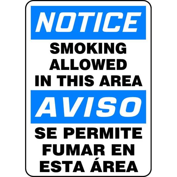 Smoking Area Sign, Sign Subject Matter No Smoking, Height 14 in, Width 10 in, Sign Material Aluminum, Sign Mounting Style With Mounting Holes, Header Notice/Aviso, Legend Smoking Allowed In This Area/Se Permite Fumar En Esta Area, Printed Language English, Spanish, Sign Shape Rectangle