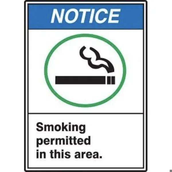 Accuform Notice Sign, NOTICE Header, TextSymbol Legend, ANSI SMOKING PERMITTED IN THIS AREA GRAPHIC Legend, 6 mil Adhesive DuraVinyl, 14 in Height, 10 in WidthSafety Signs identify and indicate potential, type and degree of hazards that may lead to accidental injury or property damage Duallayered Adhesive DuraVinyl delivers exceptional flexibility and performance, outperforming standard vinyl Printed image is protected by a highgloss UV protective coating Adhesive DuraVinyl is durable, even in the toughest indoor and outdoor conditions and adheres to most smooth, curved and irregular surfaces
