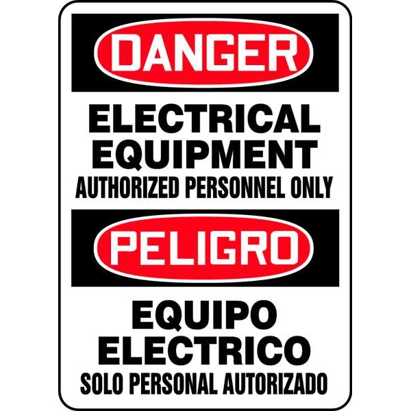 Spanish-Bilingual Danger Sign, Sign Subject Matter Electrical Hazard, Height 14 in, Width 10 in, Sign Material Vinyl, Sign Mounting Style Adhesive Surface, Header Danger/Peligro, Legend Electrical Equipment Authorized Personnel Only/Equipo Electrico Solo Personal Autorizado, Printed Language English, Spanish, Sign Shape Rectangle