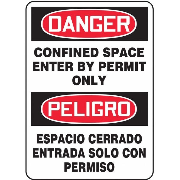 Spanish-Bilingual Danger Sign, Sign Subject Matter Confined Space, Height 14 in, Width 10 in, Sign Material Vinyl, Sign Mounting Style Adhesive Surface, Header Danger/Peligro, Legend Confined Space Enter By Permit Only/Espacio Cerrado Entrada Solo Con Permiso, Printed Language English, Spanish, Sign Shape Rectangle