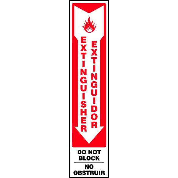 Spanish-Bilingual Fire Extinguisher Sign, Sign Subject Matter Fire Equipment, Height 18 in, Width 4 in, Sign Material Plastic, Sign Mounting Style With Mounting Holes, Header No Header, Legend Extinguisher Do Not Block/Extinguidor No Obstruir, Printed Language English, Spanish, Sign Shape Rectangle