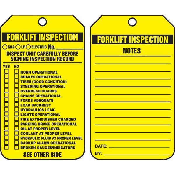 Tag, Compatible Tag Holder Mfr Part Number TSS904, Compatible Tag Insert Mfr Part Number Not Applicable, Fastener Attachment Length Not Applicable, Fastener Type Not Applicable, Header Wording (Reverse Side) Forklift Inspection, Header Wording Forklift Inspection, Height 5 3/4 in, Indoor/Outdoor Usage Indoor/Outdoor, Lamination Type Not Laminated, Language English, Mounting Hole Reinforcement Type Brass Grommet, Mounting Hole Size 3/8 in, Number of Tags 25