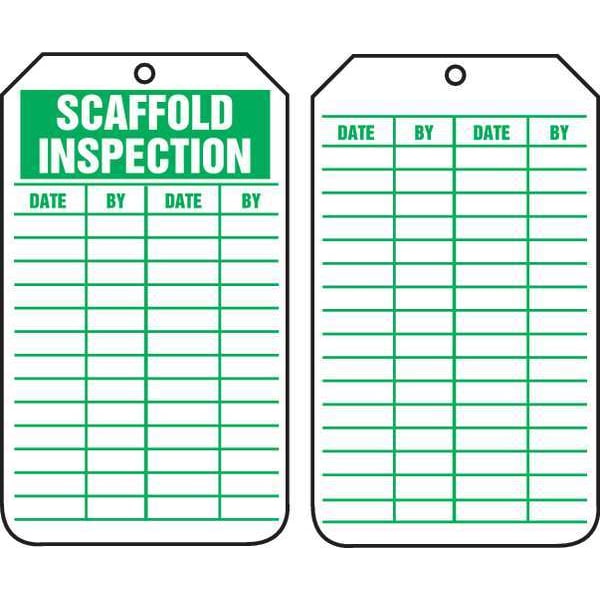Tag, Compatible Tag Holder Mfr Part Number TRS902, Compatible Tag Insert Mfr Part Number Not Applicable, Fastener Attachment Length Not Applicable, Fastener Type Not Applicable, Header Wording (Reverse Side) No Header, Header Wording Scaffold Inspection, Height 5 3/4 in, Indoor/Outdoor Usage Indoor/Outdoor, Lamination Type Not Laminated, Language English, Mounting Hole Reinforcement Type Brass Grommet, Mounting Hole Size 3/8 in, Number of Tags 25