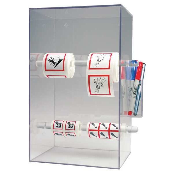 Tape and Label Dispenser, Label Dispenser Style Manual, Dispenser Mount Type Table Top, Overall Height 14 in, Overall Length 8 1/2 in, For Max. Label Width 3 in, For Max. Roll Dia. 3 in, Material Acrylic, Includes Removable Dowels, Side Pocket for Pens