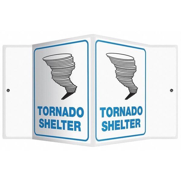 Emergency Sign, Sign Subject Matter Evacuation, Assembly or Shelter, Height 6 in, Width 8 1/2 in, Sign Material Plastic, Sign Mounting Style With Mounting Holes, V-Shaped, Header No Header, Legend Tornado Shelter, Printed Language English, Sign Shape V-Shaped