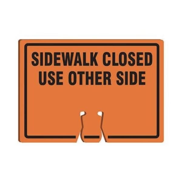 Accuform Traffic Cone Top Warning Sign, Text Legend, Legend SIDEWALK CLOSED USE OTHER SIDE, 006 in Plastic, 10 in Height, 14 in WidthAdd messages to your traffic cones Add a message on top of your cones to be seen from both directions with Cone Top Warning Signs Simply slip sign into the top of any flexible traffic cone Rugged, 0060 in thick plastic sign is printed with the same message on both sides with weather and faderesistant inks