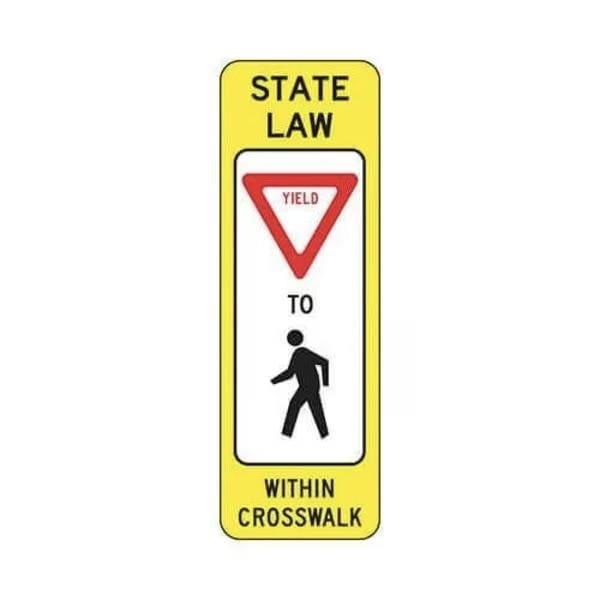 Accuform Traffic Sign, TextSymbol Legend, STATE LAW YIELD TO PEDESTRIAN WITHIN CROSSWALK MUTCD R16 Legend, 008 in Aluminum, PostFence Mount, 36 in Height, 12 in WidthTraffic signs safely direct and regulate the flow of vehicles and pedestrians in and around parking areas, dock areas and roadways Keep driveways, throughways and curbs free of vehicles and direct to designated parking locations with proper signs EngineerGrade Prismatic Traffic Signs are made of durable 0080 thick Aluminum that will not rust Microprismatic retroreflective sheeting provides added visibility in lowlight and nighttime conditions Signs are printed with UVresistant inks that prevent fading during longterm outdoor exposure and are predrilled with post mount holes