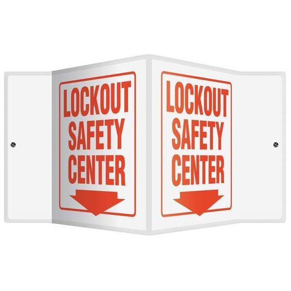 V-Shape Projection Sign, Sign Subject Matter Lockout Tagout, Height 6 in, Width 8 1/2 in, Sign Material Plastic, Sign Mounting Style With Mounting Holes, V-Shaped, Header No Header, Legend Lockout Safety Center (w/Down Arrow), Printed Language English, Sign Shape V-Shaped