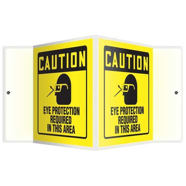 V-Shape Projection Sign, Sign Subject Matter Personal Protection, Height 6 in, Width 8 1/2 in, Sign Material Plastic, Header Caution, Legend Eye Protection Required In This Area, Printed Language English, Sign Shape V-Shaped