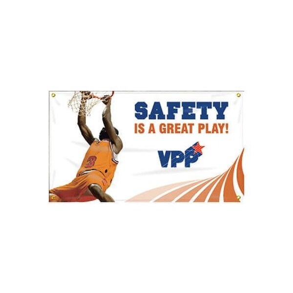 Accuform VPP Safety Banner, Legend SAFETY IS A GREAT PLAY, 10 oz Reinforced Vinyl, 28 in Height, 48 in Width, White LegendBackgroundVPP motivational banners your site is VPP Promote it now that you have met the criteria for a managed safety and health system, tell everyone about it encourage continued employee and management involvement as your partnership in the voluntary protection program VPP grows Huge banners are printed on tough, durable reinforced flexible poly sheeting with double stitched hems ideal for long life indoors, yet durable enough for outdoors Metal grommets surround the banner for mounting and hanging